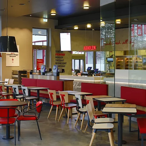 Der Restaurantbereich wurde vollständig zurückgebaut und erneuert – für einen klaren Markenauftritt, der Vertrauen schafft und einen hocheffizienten Betrieb ermöglicht.